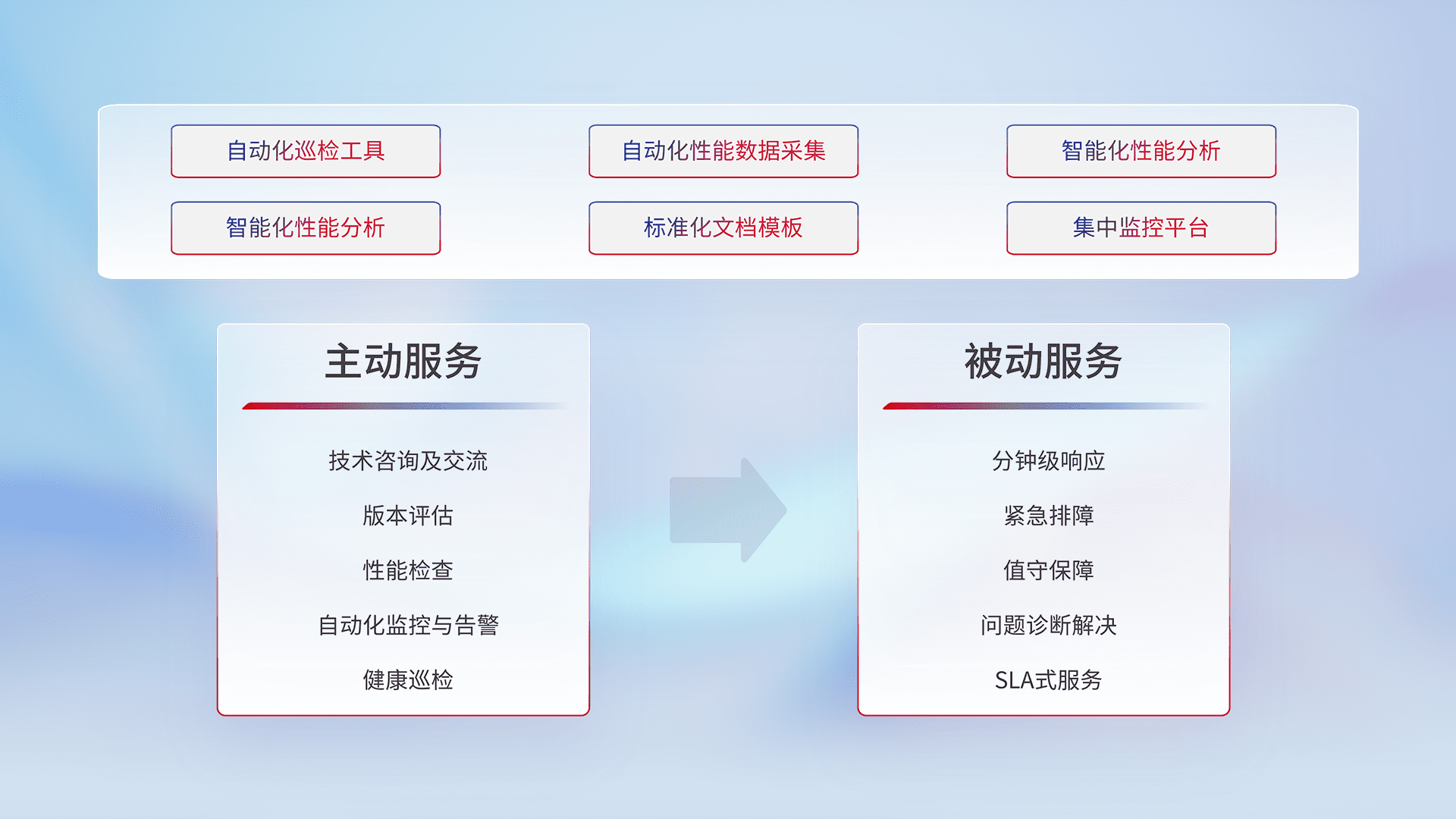 智能化工具和标准化文档,,,,保障服务质量,,,,提供主动服务(包含技术咨询、、版本评估、、、性能检查、、、、自动化监控与告警、、、、健康巡检)和被动服务包含(分钟级响应、、、紧急排障、、值守保障、、、问题诊断解决、、、SLA服务)。。。